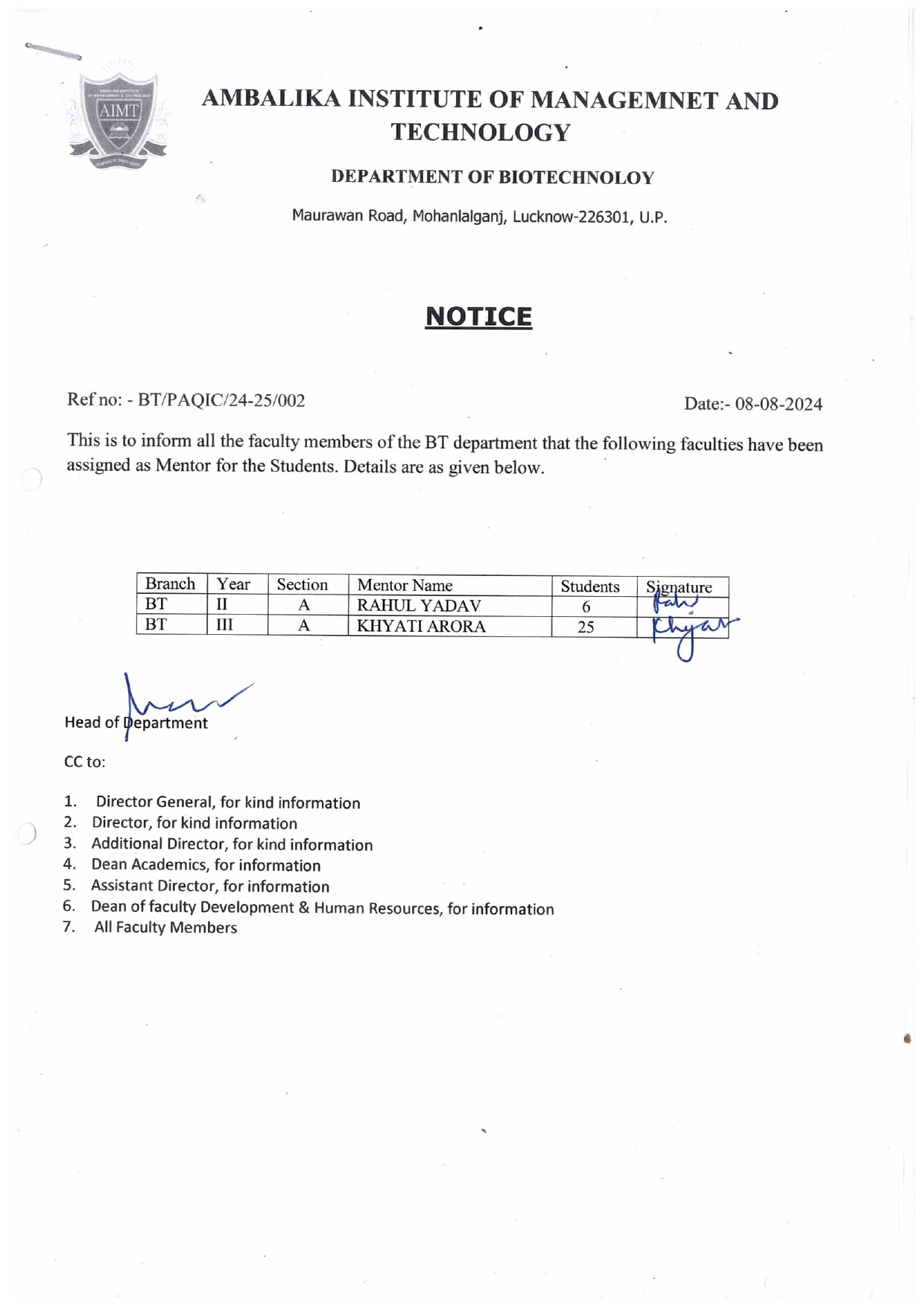 Ambalika Institute of Management and Technology offers an undergraduate program in Biotechnology, specifically, B.Tech Biotechnology. It is the best Biotechnology course in Lucknow affiliated to AKTU and follows the eight-semester structure prescribed by it.